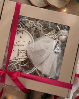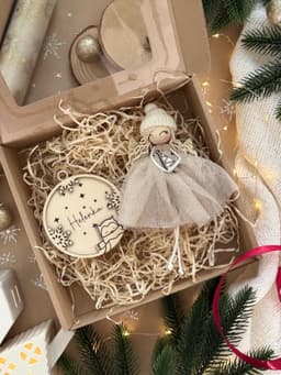 Obdaruj bliskich wyjątkowym rękodziełem i stwórz wyjątkowy zestaw prezentowy. Zestaw zawiera dwie ozdoby świąteczne: aniołka i personalizowaną bombkę.