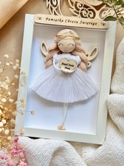 Pamiątka Chrztu Świętego dla dziewczynki "MINI" to ramka o rozmiarze 15x20 cm. Aniołek w ramce wykonany jest ze sznurów bawełnianych, oraz elementów ze sklejki brzozowej.