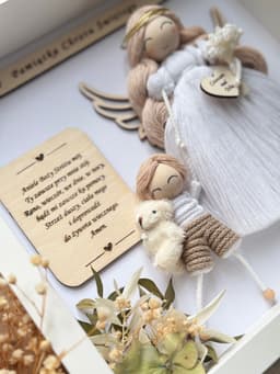 Pamiątka Chrztu Świętego dla dziewczynki "GABLOTKA ANIELICA Z MALUSZKIEM" to ramka o rozmiarze 27x27 cm z pleksi z przodu. Aniołek w ramce wykonany jest ze sznurów bawełnianych, oraz elementów ze sklejki brzozowej. Pleksi z przodu ramki chroni przed zakurzeniem.