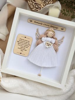 Pamiątka Chrztu Świętego dla dziewczynki "GABLOTKA" to ramka o rozmiarze 27x27 cm z pleksi z przodu. Aniołek w ramce wykonany jest ze sznurów bawełnianych, oraz elementów ze sklejki brzozowej. Pleksi z przodu ramki chroni przed zakurzeniem.