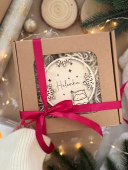 Na każdej z bombek umieść swój własny krótki tekst. Może to być np. imię, albo "Pierwsze Święta Helenki", "Nasze pierwsze wspólne święta", "Wesołych Świąt" itp. Zawieszka jest idealnym dodatkiem do prezentu lub może stanowić samodzielny drobny podarunek.