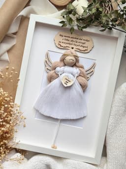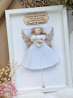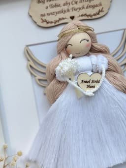 Anioł Stróż ramka z cytatem to ramka o rozmiarze 20x30cm. Aniołek w ramce wykonany jest ze sznurów bawełnianych, oraz elementów ze sklejki brzozowej.