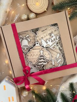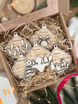 Piękny i bardzo oryginalny zestaw 5 zawieszek choinkowych. Na każdej zawieszce wygrawerowany jest motyw z jednej polskiej kolędy.
